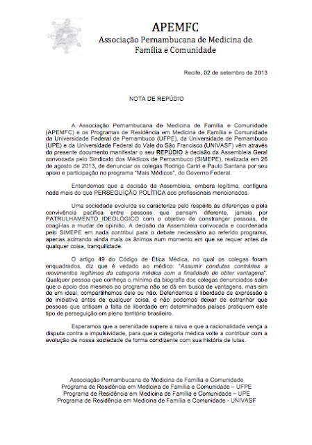 Frente à decisão do Sindicato dos Médicos de Pernambuco (Simepe) de denunciar dois médicos da Universidade Federal de Pernambuco (UFPE) por sua participação no curso voltado para os participantes do programa Mais Médicos, a Associação Pernambucana de Medicina de Família (APEMFC), junto com Programas de Residência de Medicina de Família e Comunidade (PRMFC) de Pernambuco, decidiu publicar a nota de repúdio abaixo: